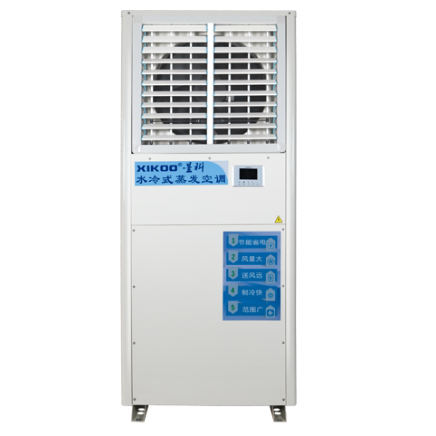 首先由外機(jī)采用濕簾蒸發(fā)式冷凝的技術(shù)來給循環(huán)水降溫,水溫降至常溫后流經(jīng)內(nèi)機(jī)的熱交換系統(tǒng)(此時(shí)壓縮機(jī)已運(yùn)作,已將冷媒壓縮成高溫高壓狀態(tài))從而帶走大部分高溫冷媒的熱量而形成常溫冷媒,常溫冷媒再經(jīng)過節(jié)流閥后變成低溫低壓的冷媒,輸送至內(nèi)機(jī)上半部分的蒸發(fā)器而吹出冷風(fēng);