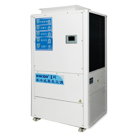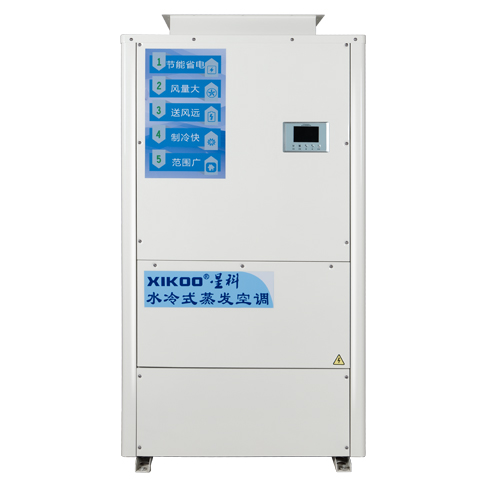 首先由外機(jī)采用濕簾蒸發(fā)式冷凝的技術(shù)來給循環(huán)水降溫,水溫降至常溫后流經(jīng)內(nèi)機(jī)的熱交換系統(tǒng)(此時(shí)壓縮機(jī)已運(yùn)作,已將冷媒壓縮成高溫高壓狀態(tài))從而帶走大部分高溫冷媒的熱量而形成常溫冷媒,常溫冷媒再經(jīng)過節(jié)流閥后變成低溫低壓的冷媒,輸送至內(nèi)機(jī)上半部分的蒸發(fā)器而吹出冷風(fēng);